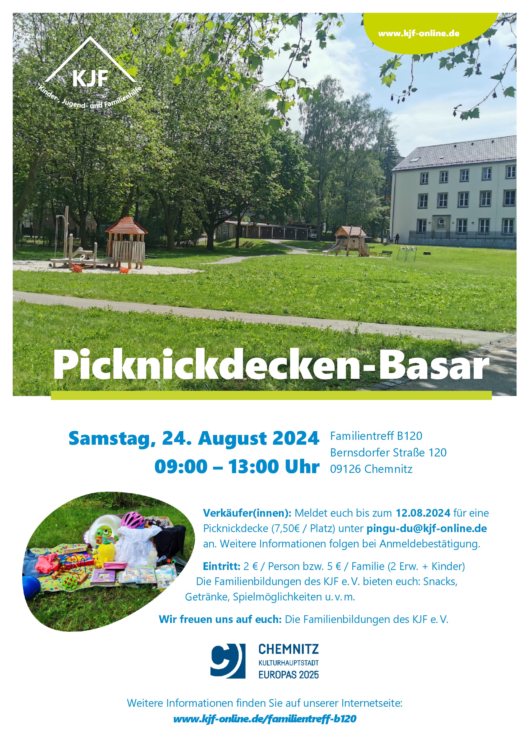 ,,Mit Familien – Für Familien." Nach diesem Motto findet unser ersten Picknickdecken-Basar im Familientreff B120 statt. Die Familienbildungen des KJF e.V. bieten euch Snacks, Getränke, Spielmöglichkeiten und weiteres.