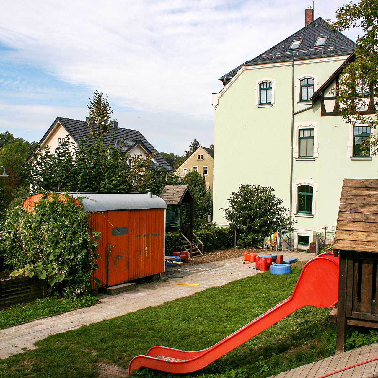 Unser Kinderhaus wurde 2004 im ehemaligen Rathaus von Erfenschlag eröffnet. Am Stadtrand von Chemnitz gelegen und umgeben von Natur bietet es Platz für 33 Kinder. Wie der Name schon sagt, ist unsere Einrichtung ein Kinderhaus, ein Ort, den sich Kinder zu eigen machen. Sie sollen sich hier wohlfühlen, gemeinsam die Welt erkunden und Vertrauen in sich und andere erfahren. Begleitet werden sie dabei von verlässlichen Personen, die an sie glauben, sie unterstützen und ihnen ermöglichen, Dinge selber zu tun.